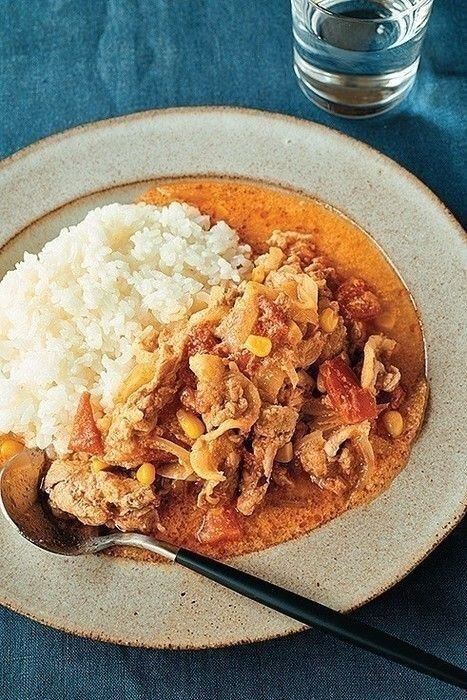 こちらはカレーケチャップ味の「味つき冷凍肉」を使った豚こまトマトカレーです。豚肉に味がついているから、ルウも不要!冷凍肉は凍ったまま使用し、トマト、玉ねぎ、コーン缶といっしょに15分煮込むだけで完成です。
