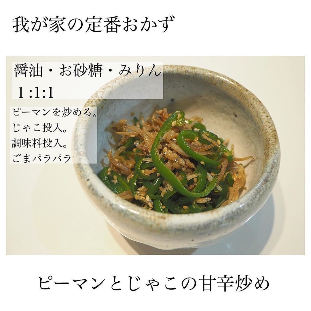 ポイ活で日々節約に励んでいるtonakayuさん宅の定番おかずは、炒めたピーマンをじゃこと調味料で和える甘辛炒め。醤油・砂糖・みりんを1:1:1で入れるだけなので、計量も楽ちんですぐに作れそうですね。大人が食べるときは、一味などを投入してピリ辛にしてもおいしいのだとか。