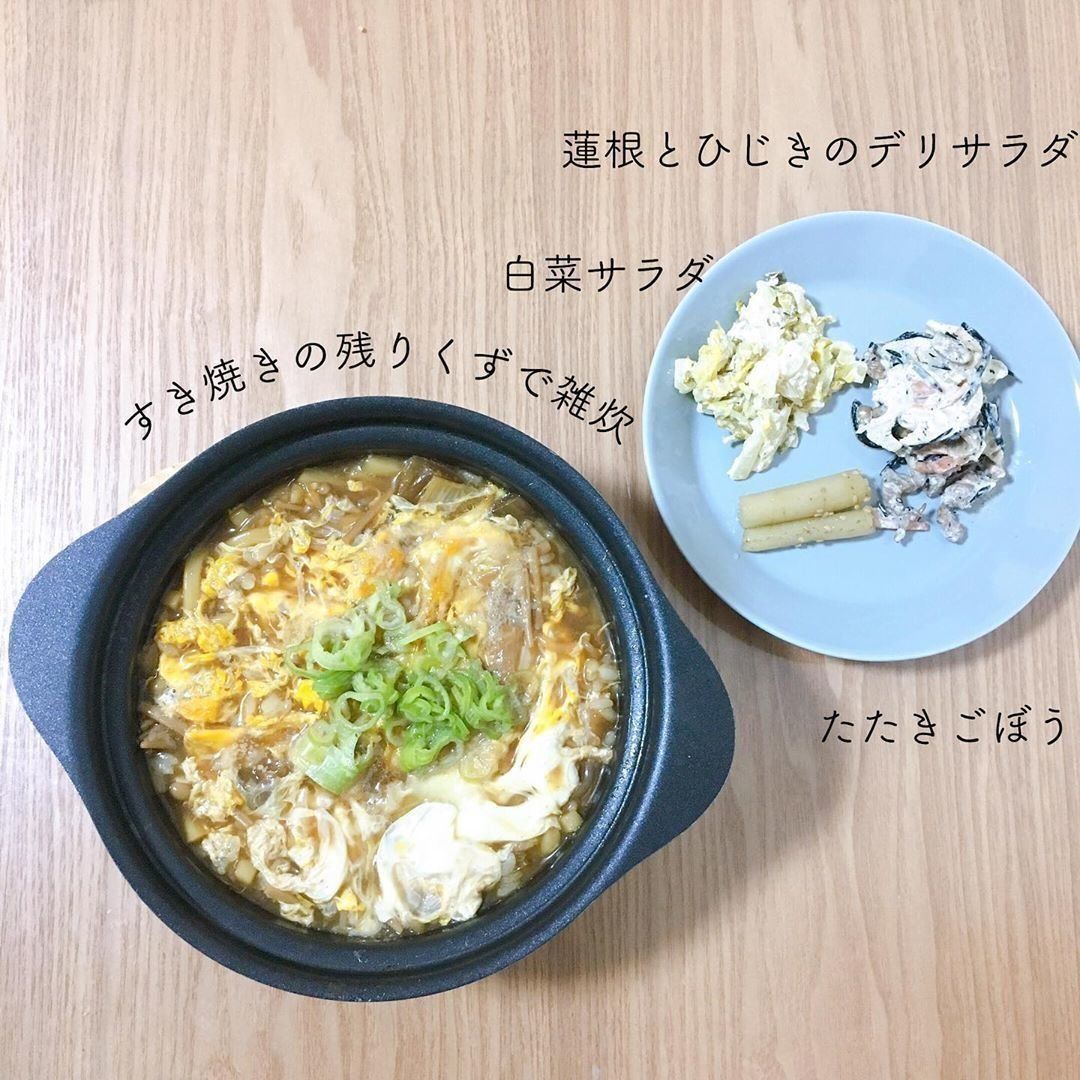 時短レシピや節約ごはんを日々実践しているmariruri.fp3さんのお宅では、すき焼きを食べた残りを翌日に雑炊にアレンジするのが定番だったそう。ごはんを卵を入れてネギを散らすだけで完成。残ったお肉や野菜も捨てることなく食べられるのは、節約にも繋がりますね。