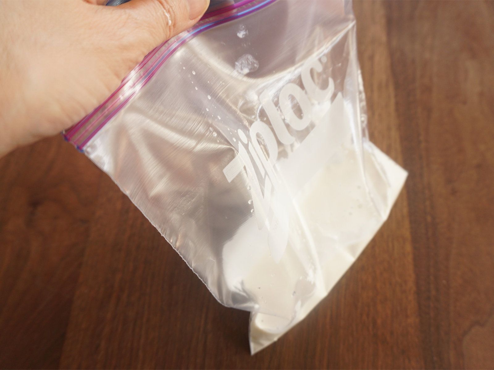 泡立て器なしでもホイップクリームをつくる裏技は、ポリ袋を使うこと。ポリ袋の中に生クリームと砂糖、早く泡立てたいのであればレモン汁もしくはジャムを入れて、しっかりと口を縛ってから、ひたすら振り回します。なかなか泡立たないときは、1分程度冷凍庫に入れて、また振ると泡立ちやすくなります。ジッパーつきのものだと、もれにくく安心です。