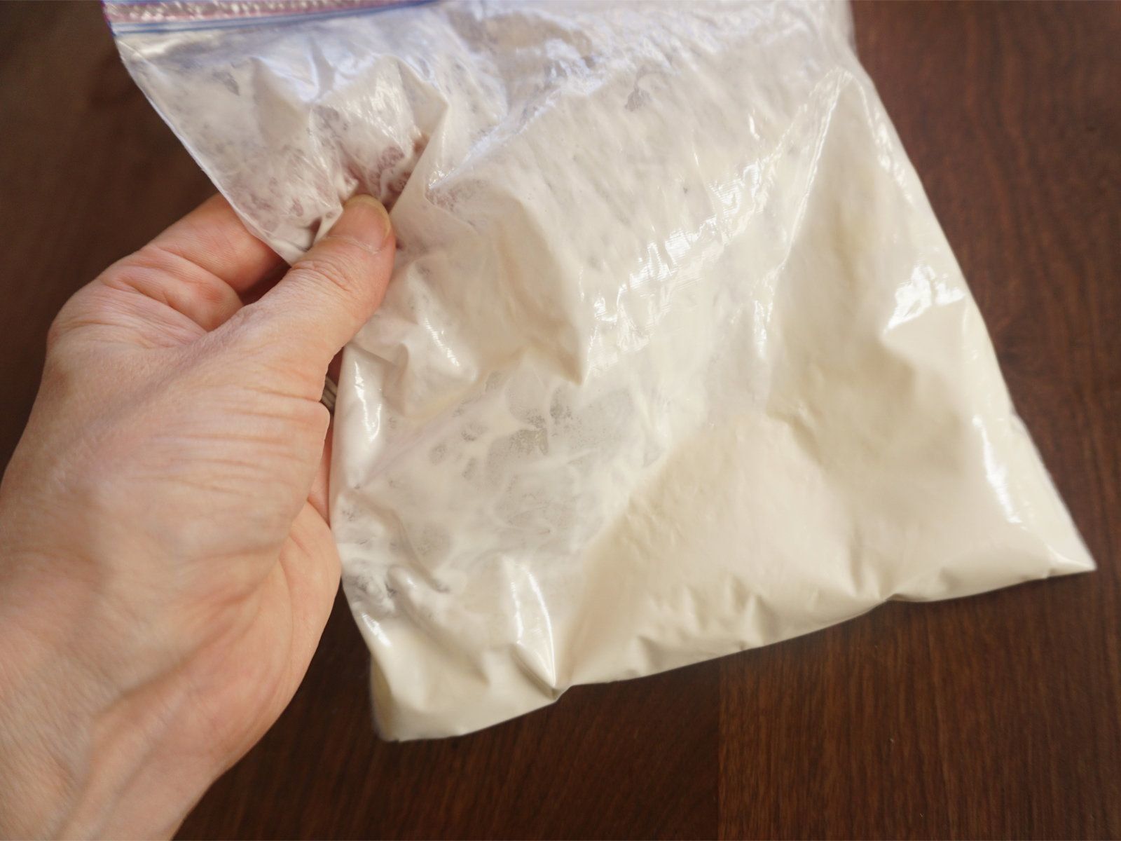 泡立て器を使うよりは時間がかりますが、洗いものなし。袋の角をカットすれば、そのまま簡易の絞り袋として使うこともできます。量が多いときには、やはり泡立て器がないとたいへんです。少量必要なときに便利な方法です。