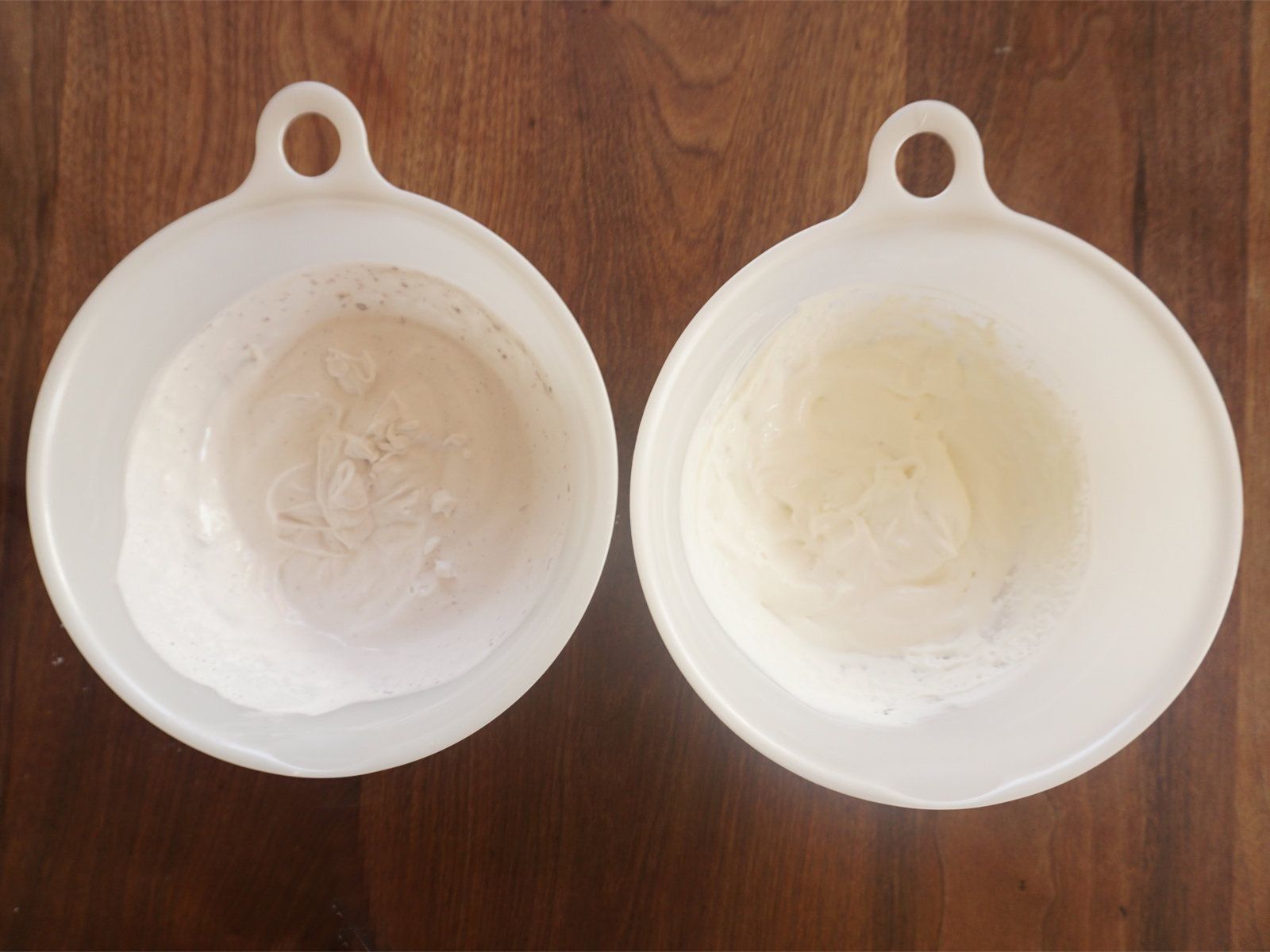 真っ白に仕上げたいときには向きませんが、色のついたクリームを手軽につくることができます(下の写真ではブルーベリージャムを加えて泡立てたものです)。
