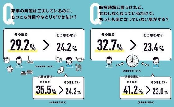 共働き世帯、専業主婦世帯ともに、家事負担を軽くするための工夫「時短家事」をしていても、やるべき家事が減っていない、と感じている人が約3~4割いることがわかりました。別の調査結果では、問題点として家事に費やす時間ではなく、家事の量自体が減らないと負担も減らない=ゆとりや余裕ができないことがあげられています。