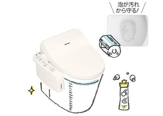 泡でコーティングすることで、輪じみやこびりつき汚れをブロック。便器の水面を覆った泡のクッションで飛び散りも軽減。泡は台所用洗剤で作れるのも魅力です。