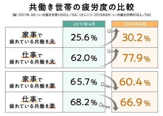 2019年30・40代夫婦のライフスタイル調査第3弾によると、2017年の調査に比べて2019年は家事&仕事で疲れている夫の比率がアップしているのに対し、妻の疲労度は微減。総合的に夫婦ともに家事で疲れていることがわかります。
