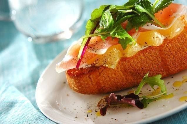 朝食にぴったりなオープンサンドは、グレープフルーツや生ハムなどの具材をのせるだけでOK!見た目も華やかなので、パーティーフードにもぴったりです。カリっとしたパンの食感とさわやかなグレープフルーツの酸味に、やみつきになること間違いなし。