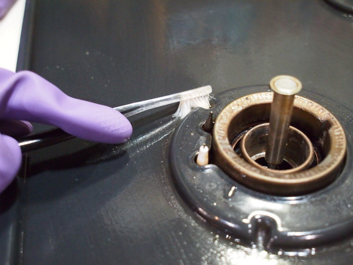 つけ置いていた五徳などは焦げとりスポンジなどで汚れをこそげ落とします。細かいところやこびりついた汚れなどはスクレイパーで取っていきます。最後は、乾いた雑巾でひとつひとつ丁寧に拭きます。五徳などをもどしたら、必ず着火テストをしましょう。