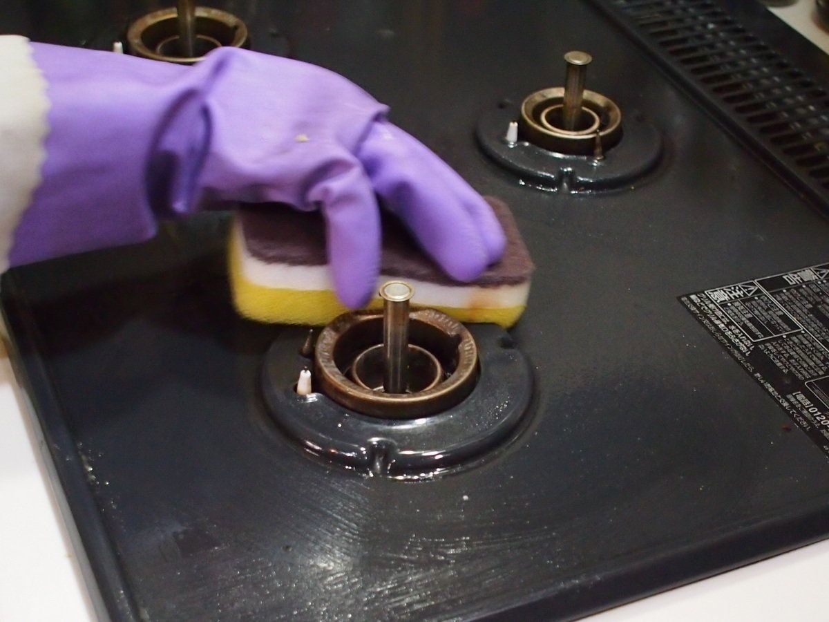 五徳などをつけ置きしている間に、天板を掃除しましょう。天板は素材によってはキズがついきやすいので、金属たわしやナイロンたわしでこするのはやめておいたほうがいいでしょう。