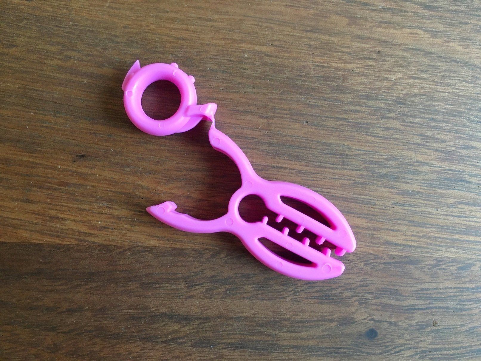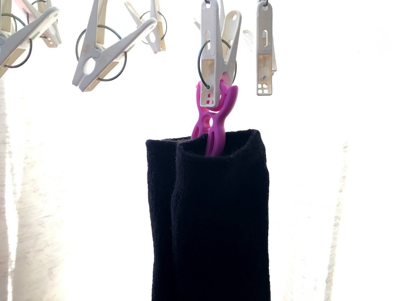 洗濯が終わったら、クリオネの頭に当たる部分をそのままピンチではさんで乾かせます。取り込んだあともセットになったままで迷子にならないので、洗濯ものを畳むときに、「もう片っぽはどこ?」と探すこともなくなります。