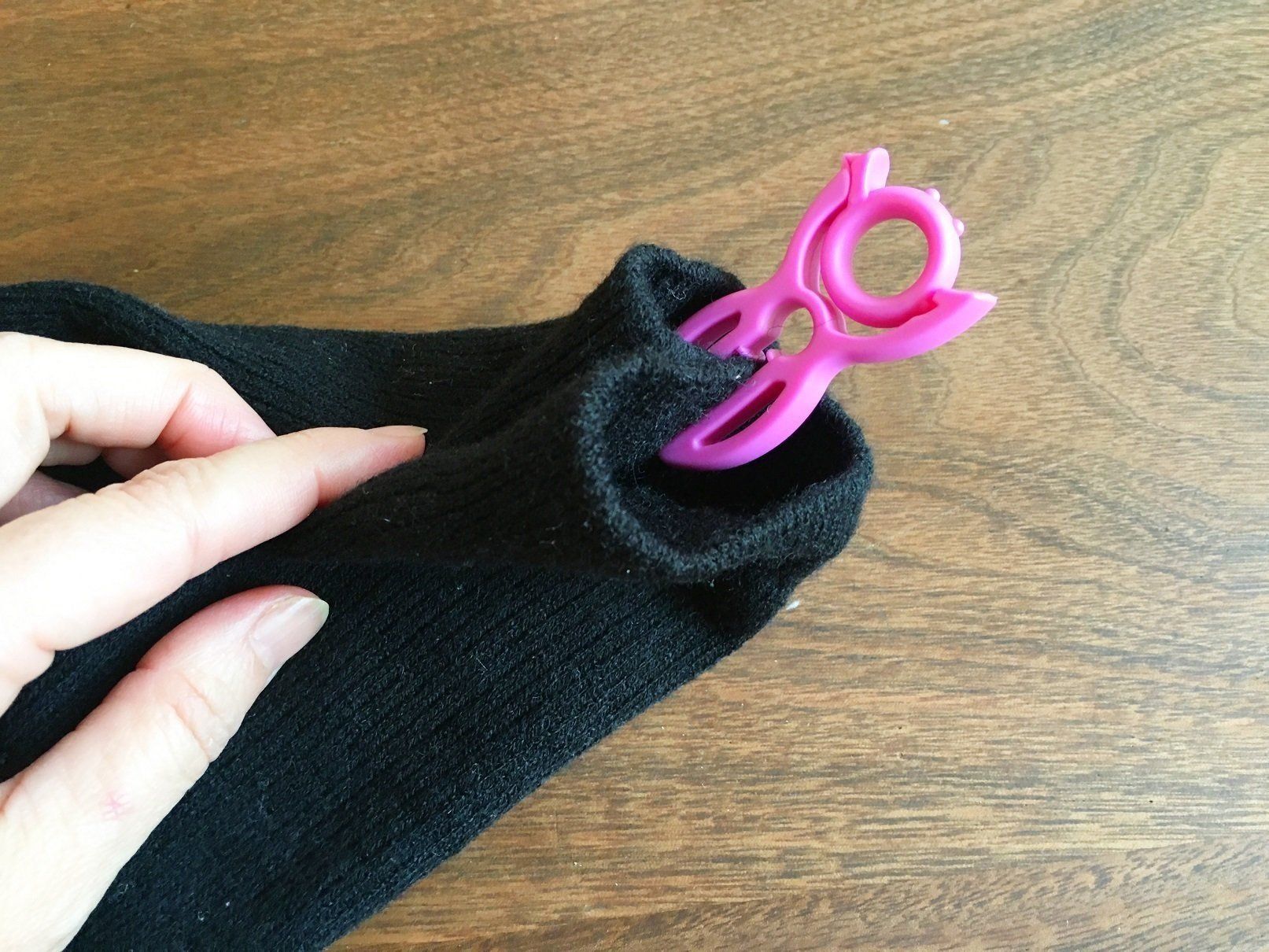 洗濯前につま先もしくは履き口の部分を左右1セットいっしょにつまんで、洗濯機に入れるだけ。クリオネ型のクリップがしっかりとはさんでくれるので、洗濯機の中で行方不明になることはありません。