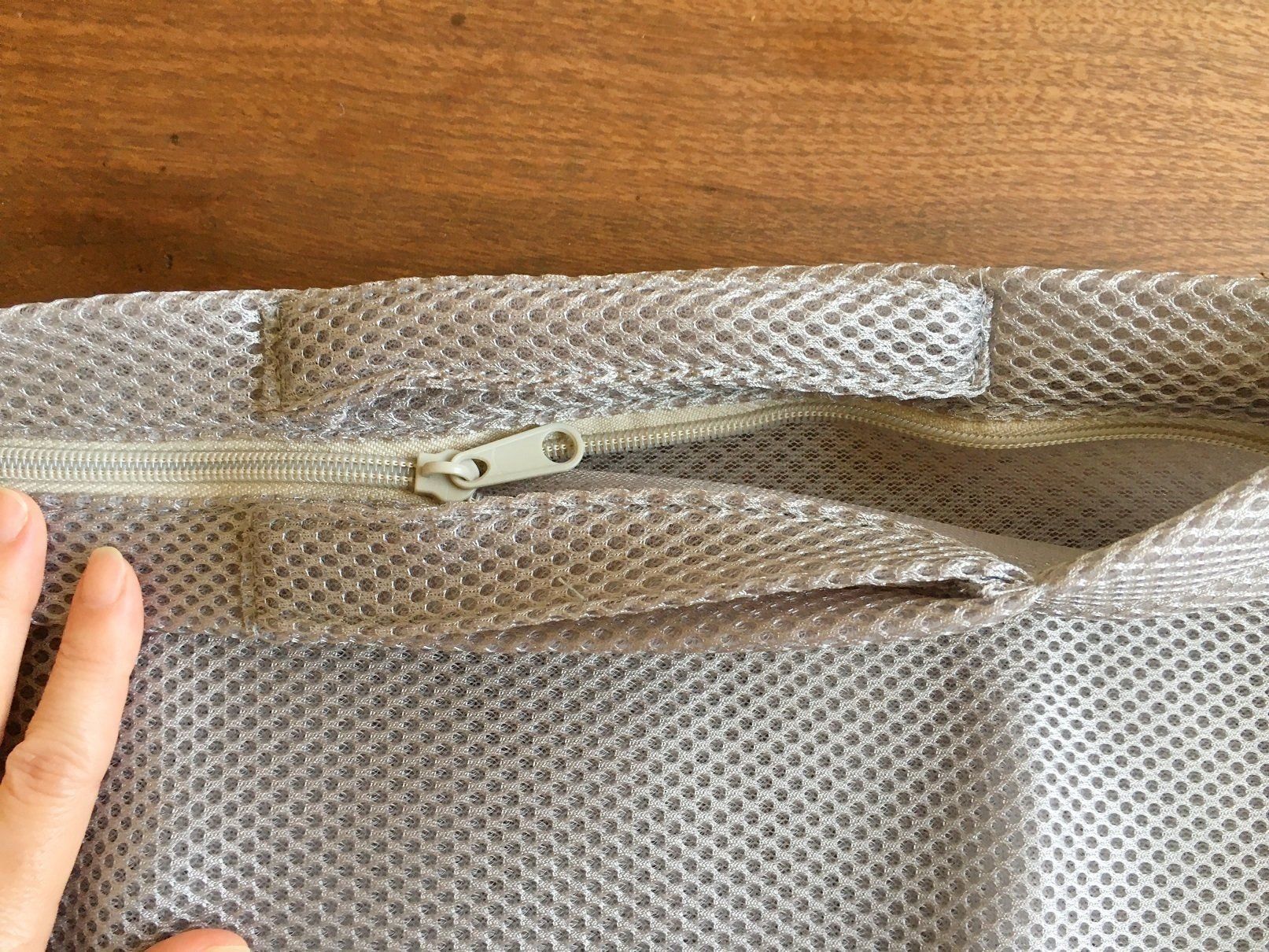 取っ手があるので、持ち運びにはもちろん、洗濯機脇に引っかけておけます。また、人に見られたくないものが入っているときにはチャックを閉めておけばOK。ランドリーバッグとしてだけでなく、フィットネスクラブやスイミング用のバッグとして使って便利です。