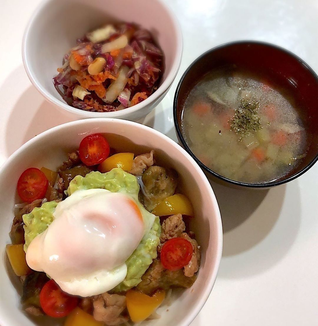 豚肉と茄子、パプリカを照り焼きタレにからめアボカドのタルタルソースと卵焼きを添えた丼ぶり。満腹感はもちろん、野菜もしっかりとれるので栄養の面も安心!まるでカフェ飯のようです。