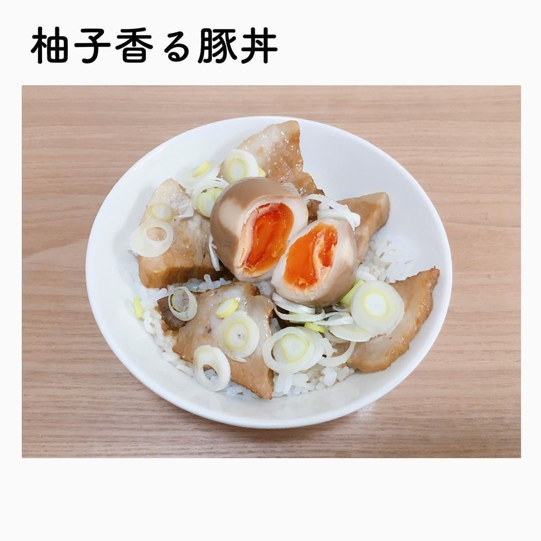 柚子香る豚丼は、豚バラブロックでつくる本格的な品!ブロックを焼いて煮汁を加えて火を通し、ご飯の上に煮卵とネギと一緒に盛りつければ完成です。いくらでも食べられそうですね。