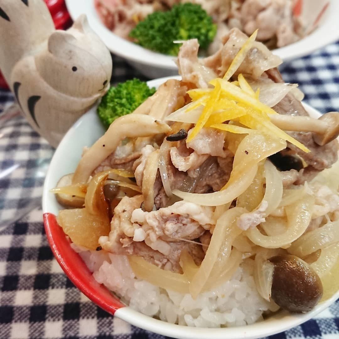 豚肉、玉ねぎ、しめじ、にんにくチューブ、ごま油を加え、調味料を加えてできる豚塩レモン丼!食欲がないときでもレモンの酸味でさっぱりと食べることができる一品です。
