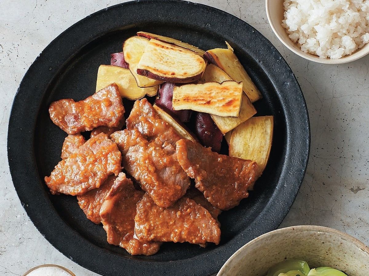 フライパンをペーパータオルでさっと拭き、サラダ油大さじ1/2を熱して豚肉を入れる。強めの中火で2~3分、焼き色がつくまで焼き、裏返して2分ほど焼いて酒をふる。火を止めて[A]を加え、ざっと混ぜて弱めの中火にかけ、豚肉にからめる。器に盛り、(1)のさつまいもを添える。