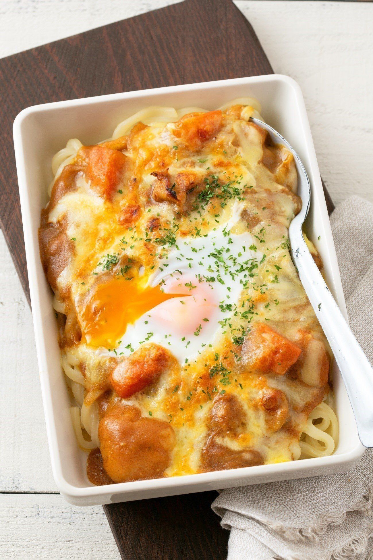 ② カレーを乗せ、ピザ用チーズを散らし、中央に卵を割り入れる。