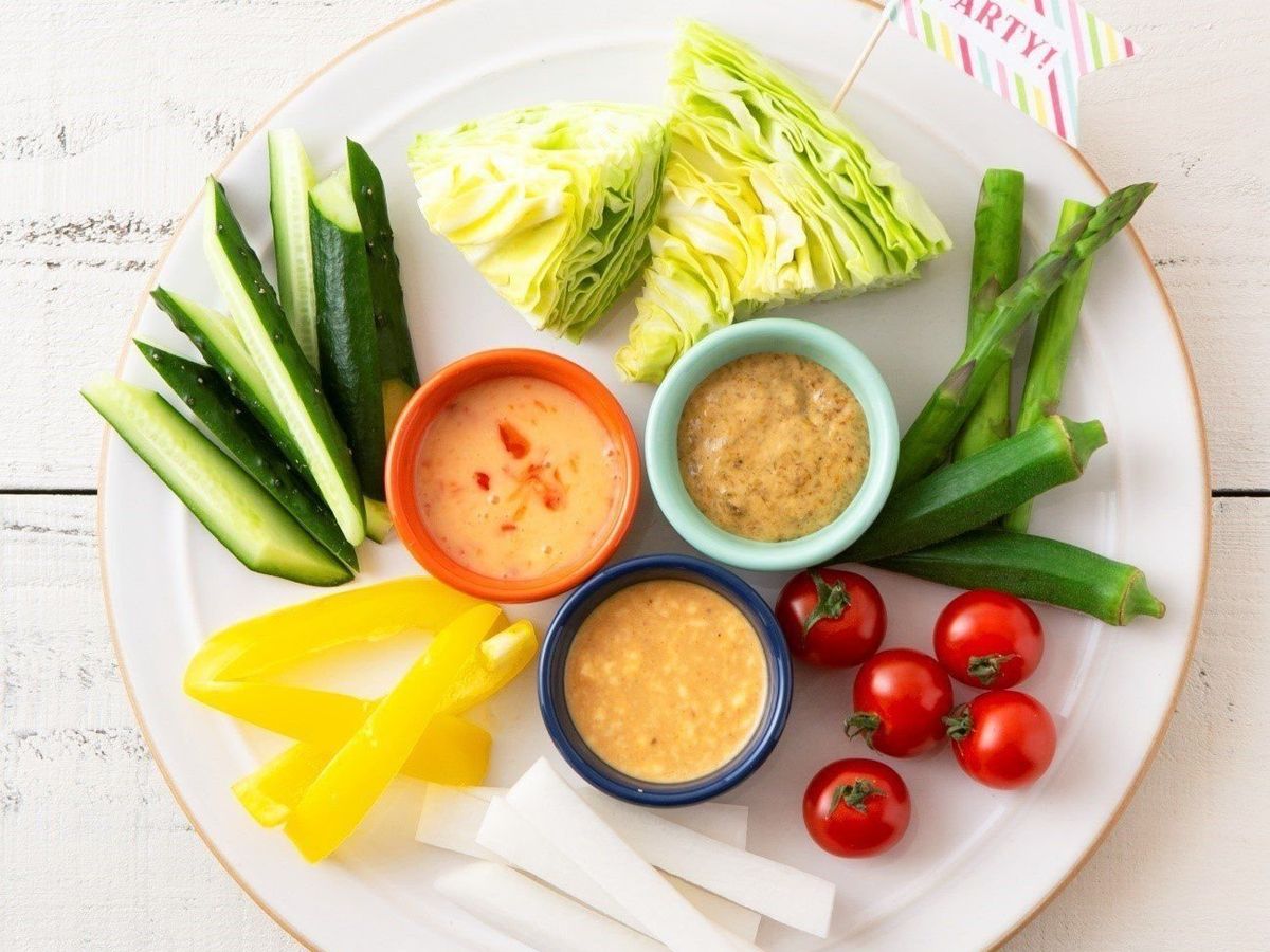 ① 野菜は食べやすく切って器に盛り、A B Cのディップを添える。