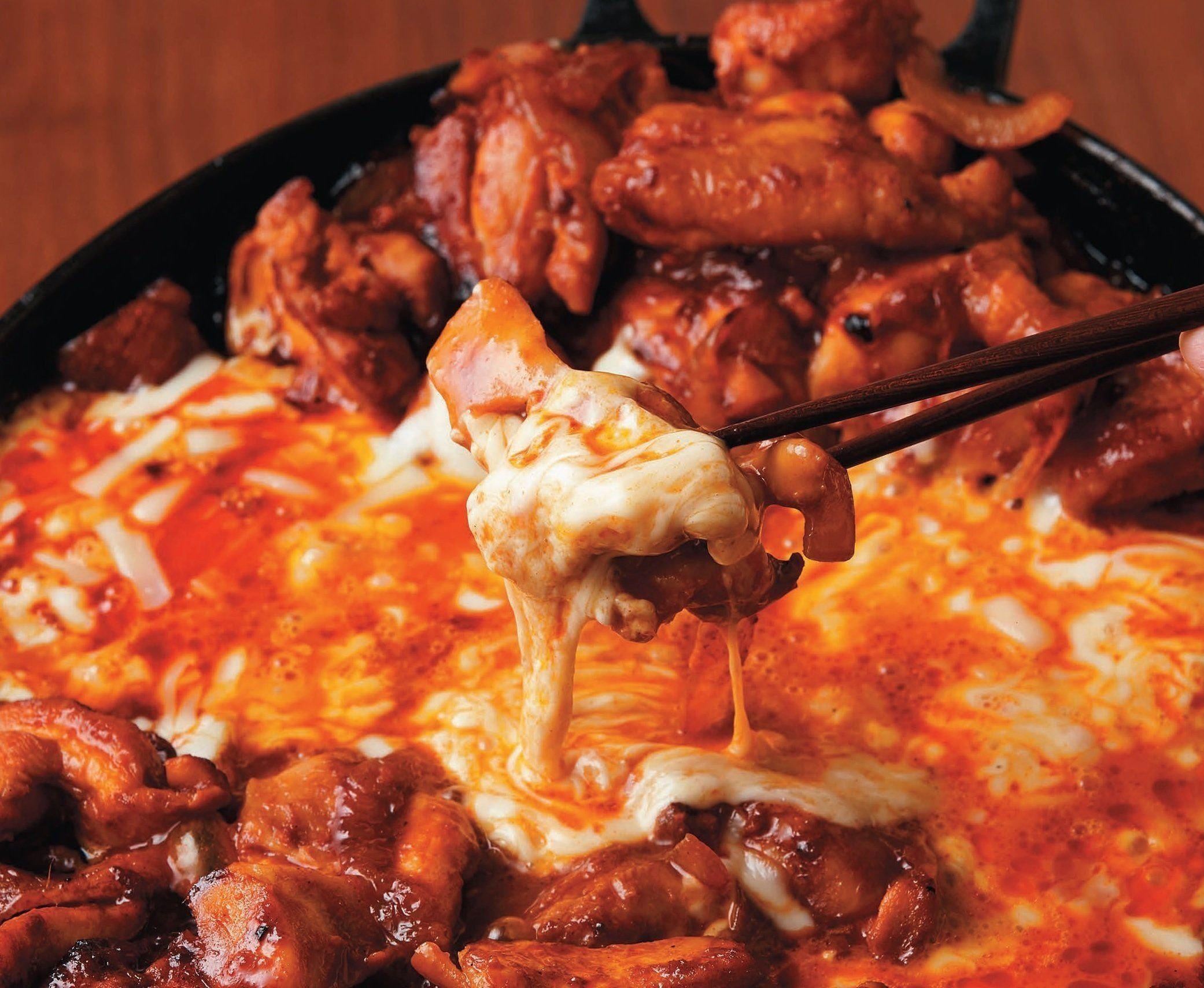 (1)に、鶏肉をたれごと加えて混ぜ、5分ほど炒める。鶏肉に火が通ったら両端に寄せ、中央を空ける。チーズを入れて温め、溶けたチーズを鶏肉にからませながら食べる。