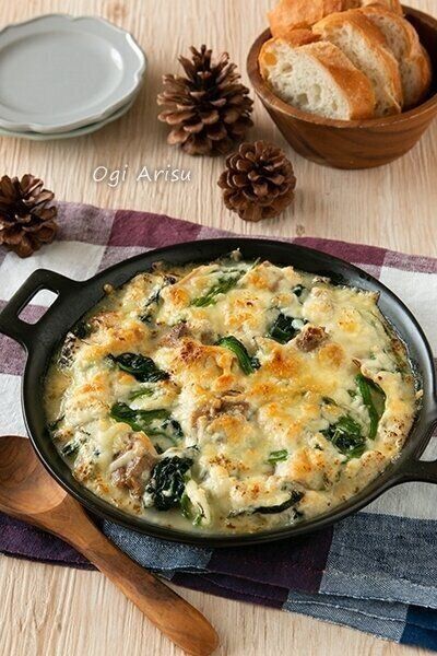 裏ごしした豆腐を使うことで、ホワイトソースいらずでグラタンがつくれる時短レシピです。チーズの焦げ目と、パンチのきいたにんにくの風味が食欲をそそります。ヘルシーなのに、鶏もも肉とほうれん草たっぷりで食べ応えも◎。