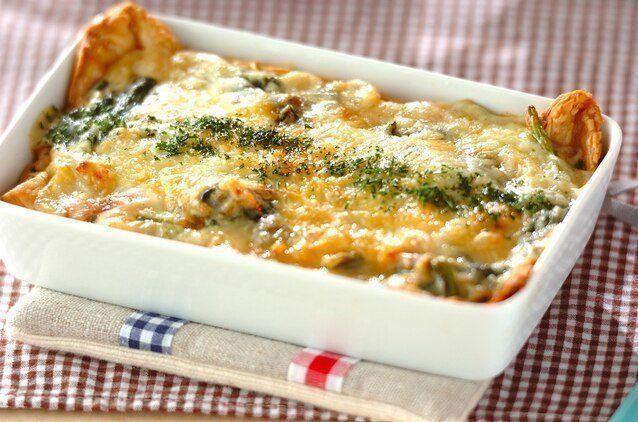 パーティーやおもてなしメニューにおすすめなのが、サクサク食感が楽しいこちらの豆乳パイ。具材はシンプルですが、ほうれん草もベーコンもチーズもたっぷり入っているので、食べごたえバツグンですよ。牛乳ではなく豆乳でつくっているので、カロリーが気になる女性にも喜ばれそうですね!
