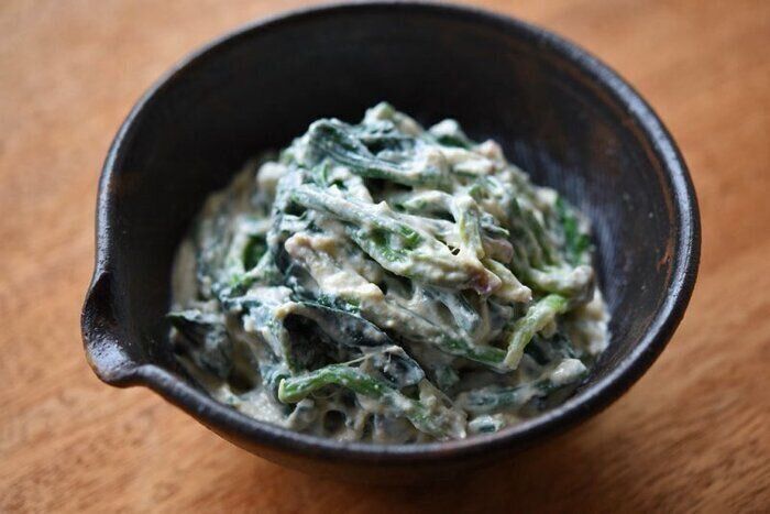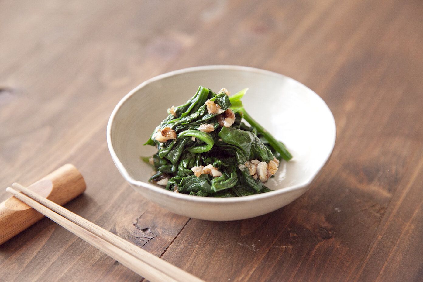 甘辛い味つけのくるみみそと、ほうれん草のほのかな苦みが絶妙にマッチする一品です。味が薄まらないように、ゆでたほうれん草は水気をしっかりとしぼってからあえてくださいね。