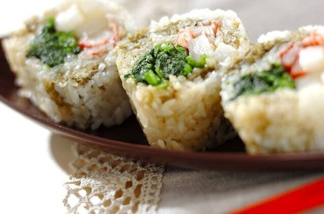 甘辛く味つけたほうれん草を、カニカマや長芋といっしょにご飯でくるり!ボリュームも見た目もバッチリの巻き寿司レシピです。食べやすいサイズで、つけダレなしでもおいしく食べられますよ。