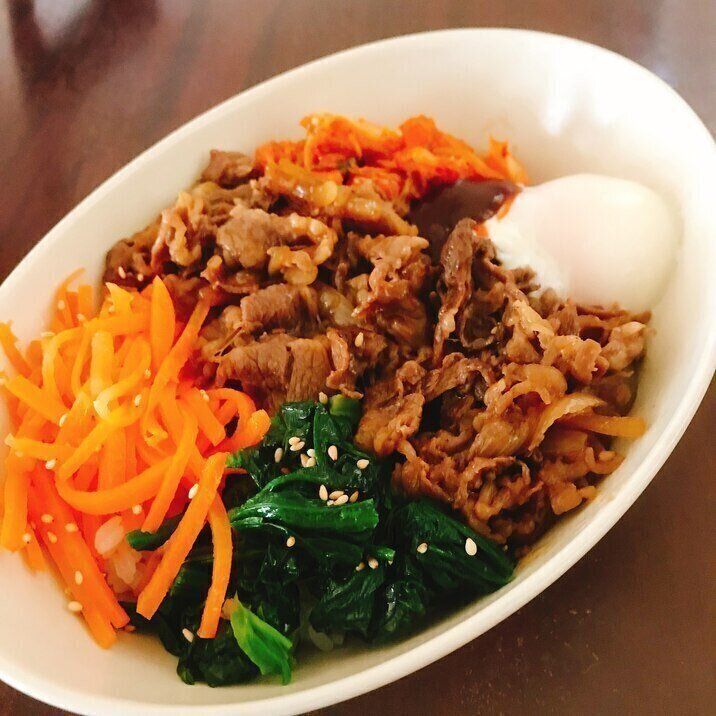 自宅で簡単につくれる、ビビン丼のレシピです。焼肉のタレをよくからめて、肉にしっかりと味をつけるのがポイント。コチュジャンやトウバンジャンの量を調整したり、お好みで七味唐辛子をかけたりしてもよいですよ。