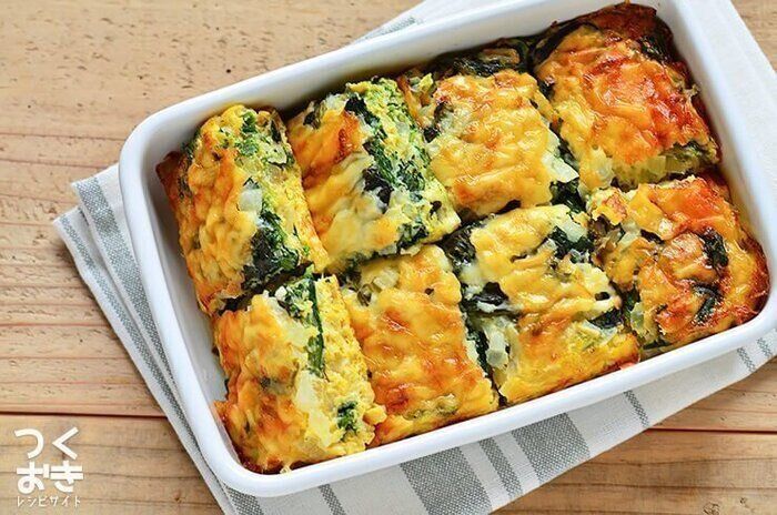 ほうれん草の緑と卵の黄色が映える、オープンオムレツレシピ。シンプルな味つけなので、野菜の自然な甘味を楽しめます。材料を混ぜ合わせてオーブンで焼くだけと、調理も簡単。冷蔵で4日ほど保存できるので、つくり置きしておくと便利ですね。