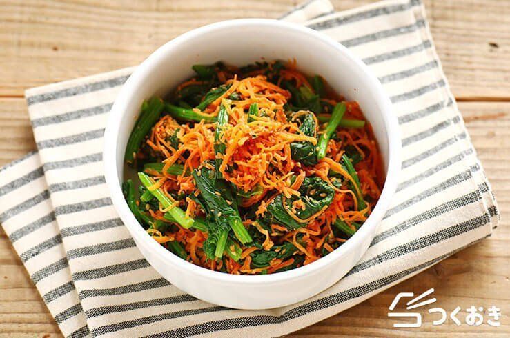 定番のほうれん草のごまあえに、にんじんをプラスしたレシピ。にんじんを入れたことで甘みが増し、より食べやすくなっています。色味がきれいなので、お弁当のおかずにもおすすめです。
