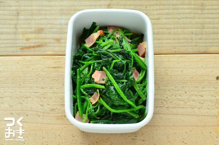 朝食~夕食まで、さらにはお弁当のおかずとしても大活躍する王道レシピです。ベーコンの塩気やバターのコクが、ほうれん草と相性バツグン!たっぷりつくって、常備菜にすると便利ですよ。