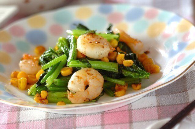 こちらは黄色・赤・緑の彩り華やかな、ホウレン草とエビのソテー。コーンとエビは冷凍食品を使うので、面倒な下処理がいらず、炒めるだけで簡単につくれちゃいます。メイン料理に添えるのに最適な一品です。