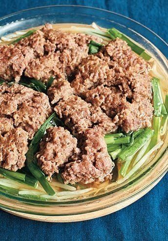 耐熱皿に、さっと水にさらしたもやし1袋、長さ5cmに切ったにら1束分、凍ったままのひき肉のうまみそだねを割って重ね、ふんわりとラップを掛ける。電子レンジで9分加熱し、そのまま3分おく。