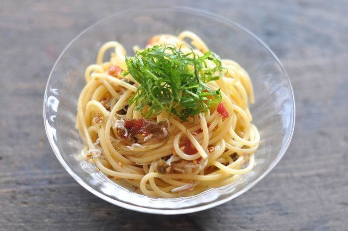 たたいた梅肉とじゃこを使った、和風の冷製パスタ。梅肉の酸味・じゃこの塩気・大葉の風味が食欲をそそります。パスタはしっかり芯までゆでてから冷水でしめると、ちょうどいいかたさになりますよ。
