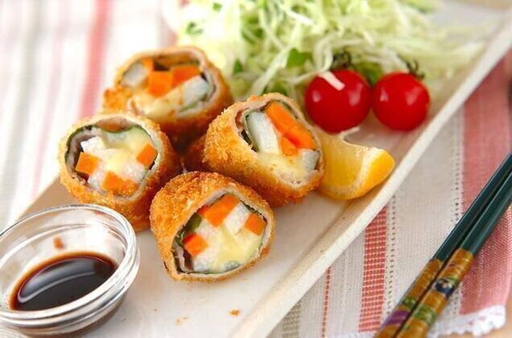 大葉、にんじん、長芋、プロセスチーズを、薄切り豚肉でくるっと巻いた豚肉のロールフライ。彩り鮮やかで、洋食のメインやお弁当のおかずにもぴったりです。レモンを絞ったり、ソースをかけたりして味の変化を楽しむのもよいですね。