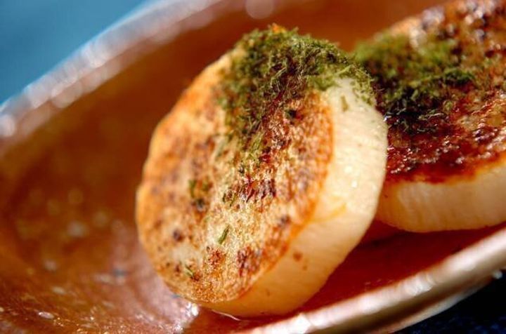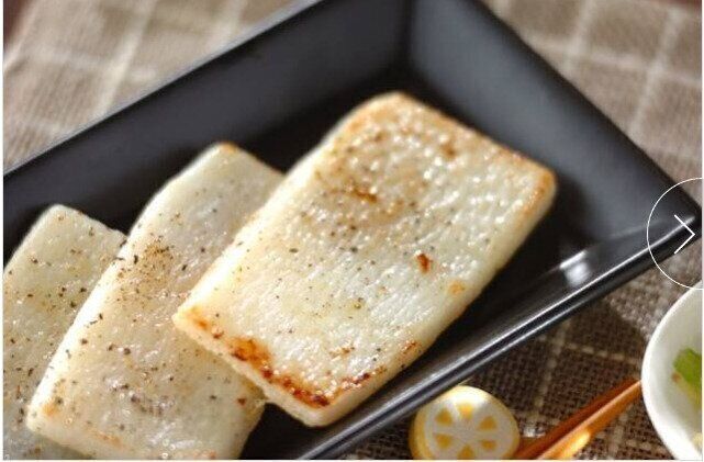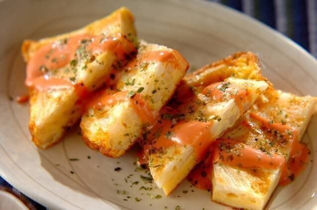 まるでおせんべいのような見た目のこちらは、長いもの磯辺揚げなんです。長いもにのりを巻いて揚げるだけなので簡単につくることができますよ。お子さまのおやつにもぴったり。熱いうちに砂糖醤油をかけていただきましょう!
