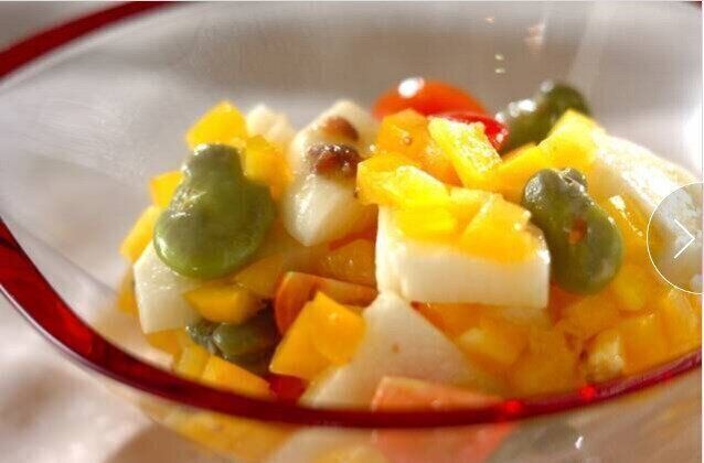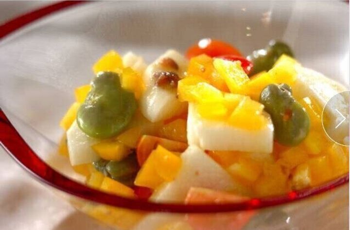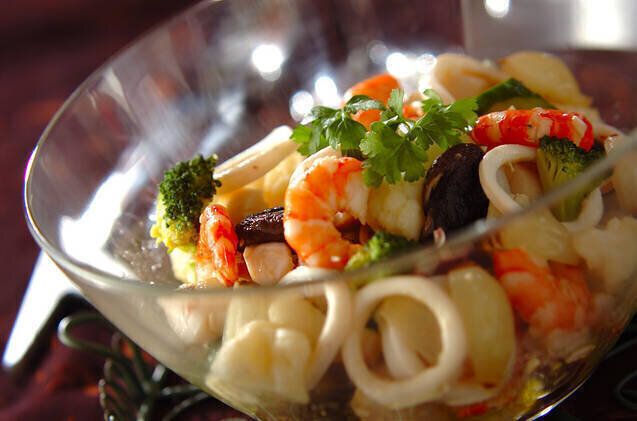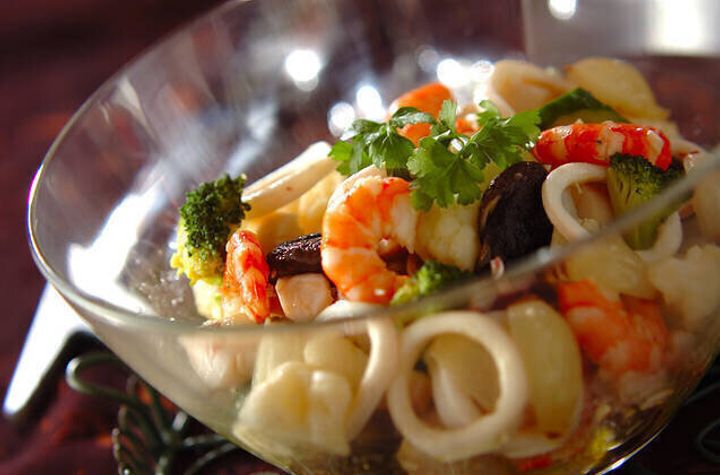 洋食の前菜、副菜にぴったりの、シーフードマリネ・白バルサミコ風味。エビ、イカなど具材たっぷりで、素揚げした長芋のシャキシャキ食感も楽しめそうです。手作りマリネ液の加え加減で、味を調整してみてくださいね。