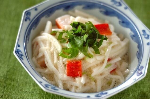 せん切りにした長いもを使った、長いもそうめんの酢の物レシピです。大きめにカットしたカニカマもくわえてごちそう感をプラスしましょう。調理時間10分ほどで手軽につくれます。