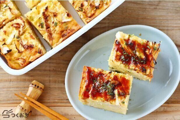 お好み焼き粉がなくても、小麦粉と長いもがあれば自宅で簡単にお好み焼きがつくれるんですよ。すりおろした長いもをたっぷり入れた生地は、ふわふわ。ソースやマヨネーズをかけて完成です。