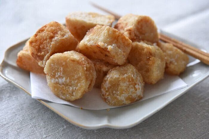 長いもの煮物が余ったら、こちらのアレンジはいかが?片栗粉をつけて揚げるだけのシンプルな調理ですが、ほんのりした甘さとだしの風味が絶品です。ぜひ、揚げたてを食べてみてください。