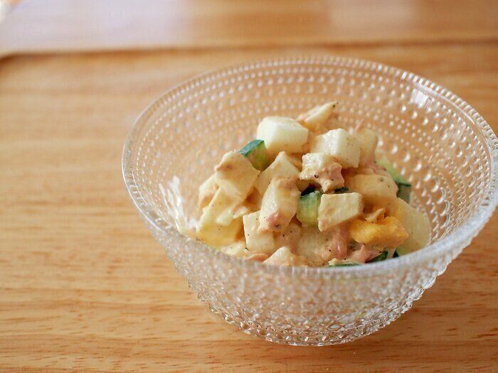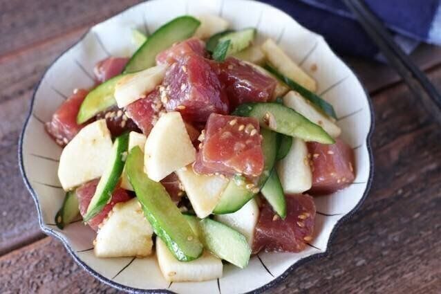 こちらも切ってあえるだけの簡単サラダですが、5分ほどタレに漬け込んだまぐろを加えることで、ごちそう感がアップ!シャキシャキの野菜と、とろっとしたまぐろのハーモニーを楽しめます。