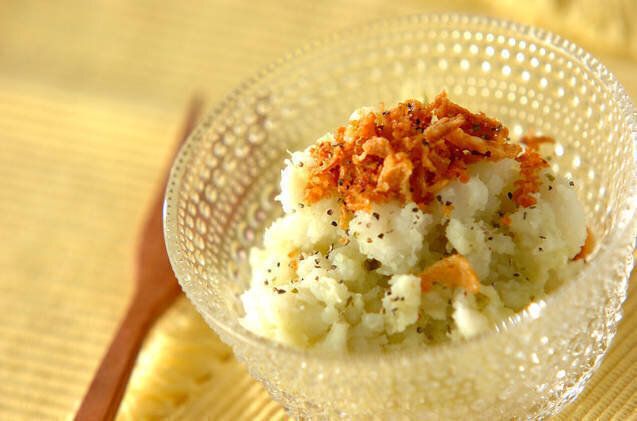 長いものジェノベーゼサラダは、じゃがいもではなく、長いもを使ったポテトサラダです。長いもをレンジで加熱し、よくつぶしてつくります。仕上がりは、“ねばねば”ではなく“ホクホク”ですよ。