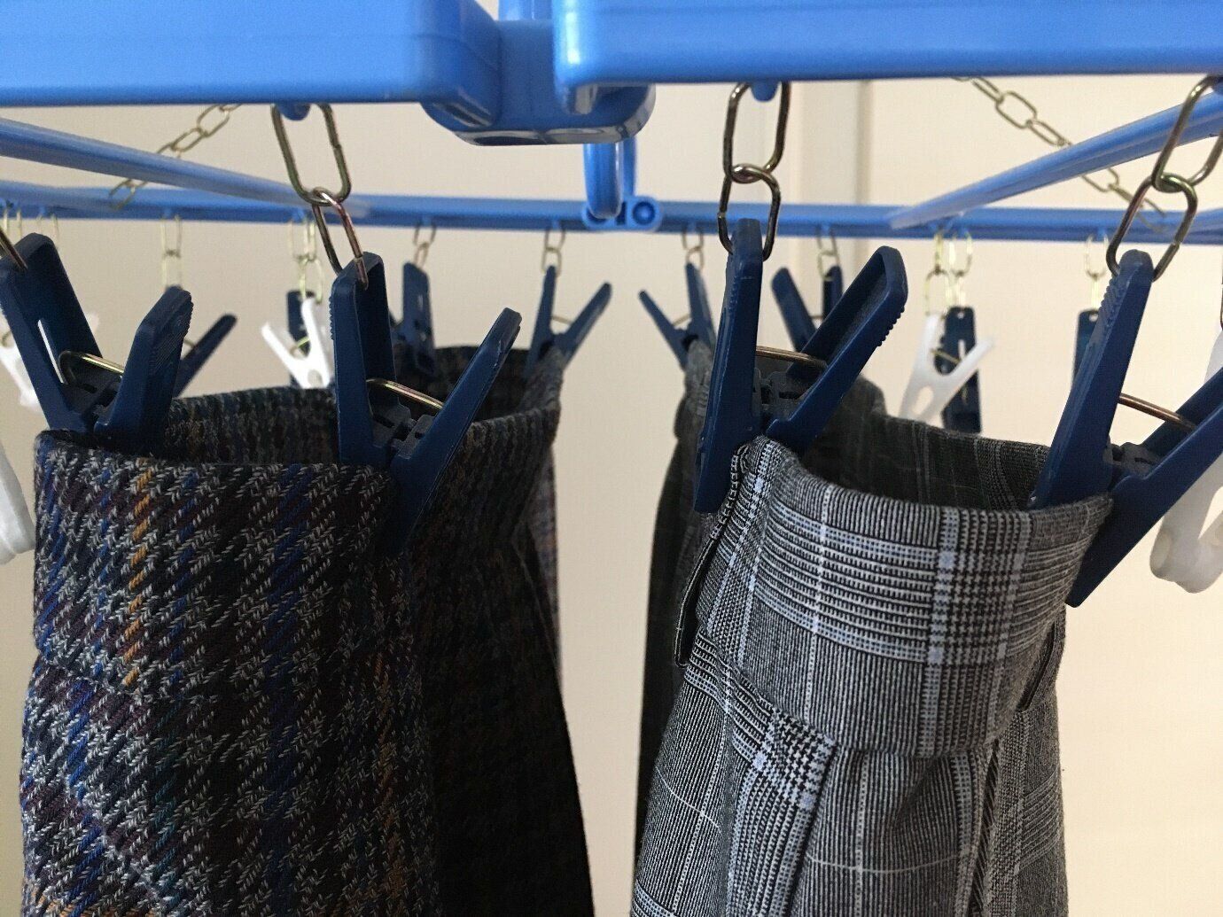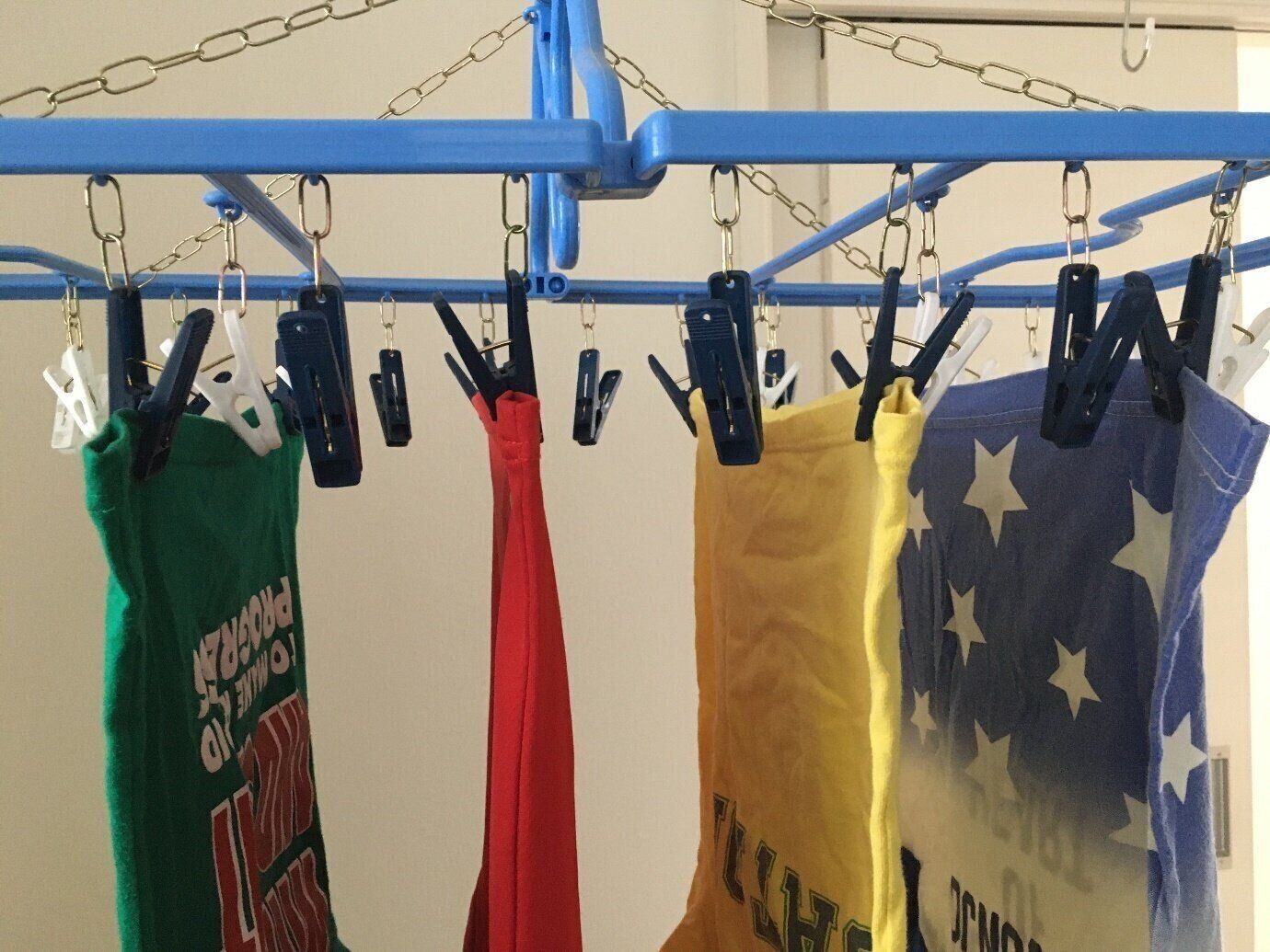 もしスペースに余裕があるなら、ピンチハンガー1個にすべてを干すよりも、ピンチハンガーを2個使って1つおきに干すのがおすすめです。そうすれば写真のように、あいだを1個ずつ空けて干すことも可能。