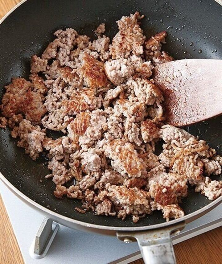 ひき肉は、固まっていたほうが食べ応えがあるので、ほぐさなくてもOK。