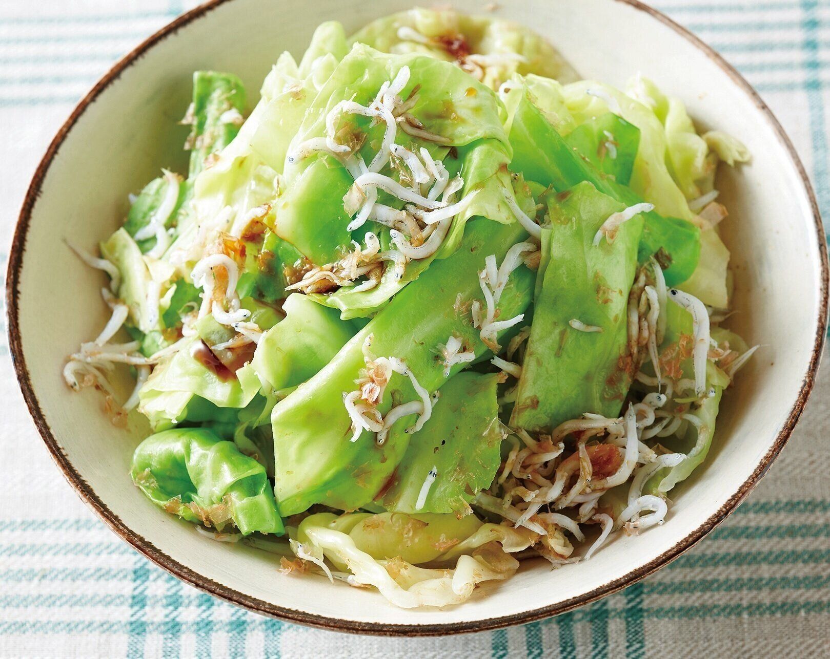 キャベツは太い軸を除いて一口大に切る。フライパンにたっぷりの湯を沸かし、塩少々を加えてキャベツをさっとゆで、ざるに上げてさます。ボウルに、キャベツ、削り節、しらす干しを入れ、しょうゆを回し入れてあえる。