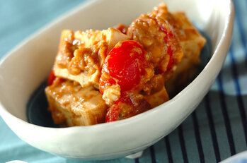 豆腐とピーナッツバター、トマトと調味料を混ぜるだけの簡単レシピです。豆腐の淡泊さとトマトの酸味をピーナッツバターのコクでマッチさせてくれます。