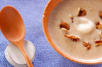 くるみの香りがふわっと広がり、葛粉のとろみもあり舌触りもよいです。あつあつの汁粉に白玉をいれているので、寒い日の朝食やおやつにもぴったりなおすすめのレシピです。