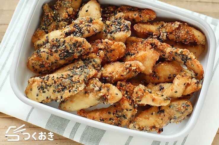 フライパンで揚げ焼きにした、ささみのごまスティックのレシピです。スティック状なので、小さい子どもが手づかみで食べることもできますよ。ささみの下味につけた生姜の香りが食欲をそそります。