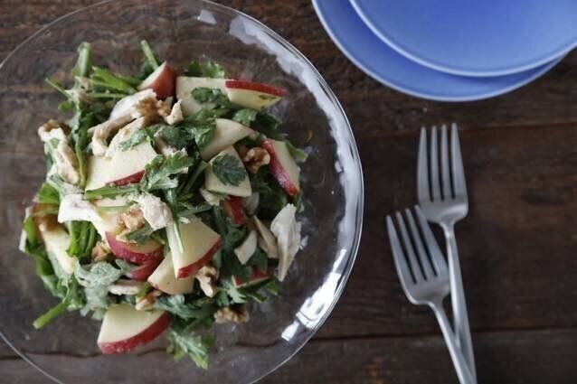 甘酸っぱいりんごと春菊の苦みが、相性バツグンのサラダレシピ。生姜が効いていて、さっぱりした味わいです。くるみをローストすることで、食感や香りがさらによくなりますよ。