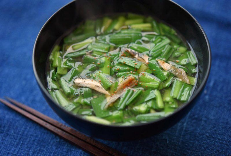 具材はニラだけという、素材の味を楽しめるシンプルなみそ汁です。出汁で使った煮干しを炒めるときに使うごま油も風味をアップしてくれます。仕上げの唐辛子やこしょうはお好みで。