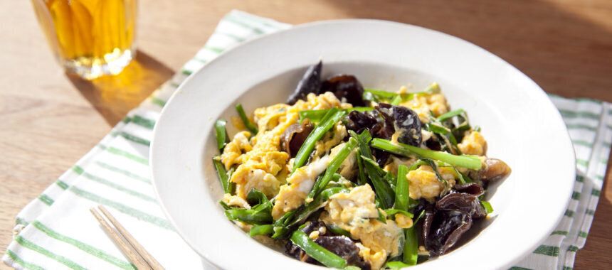 食事のメインにもなる、きくらげニラ玉。ニラときくらげをさっといため、卵を半熟程度にふわっとからめて完成です。調理時間は約5分。いそがしい日でも簡単につくれます。